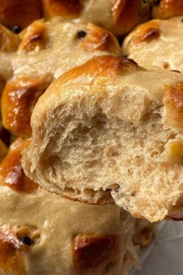 • Hot Cross Bun Loaf with buttered slices on a plate.